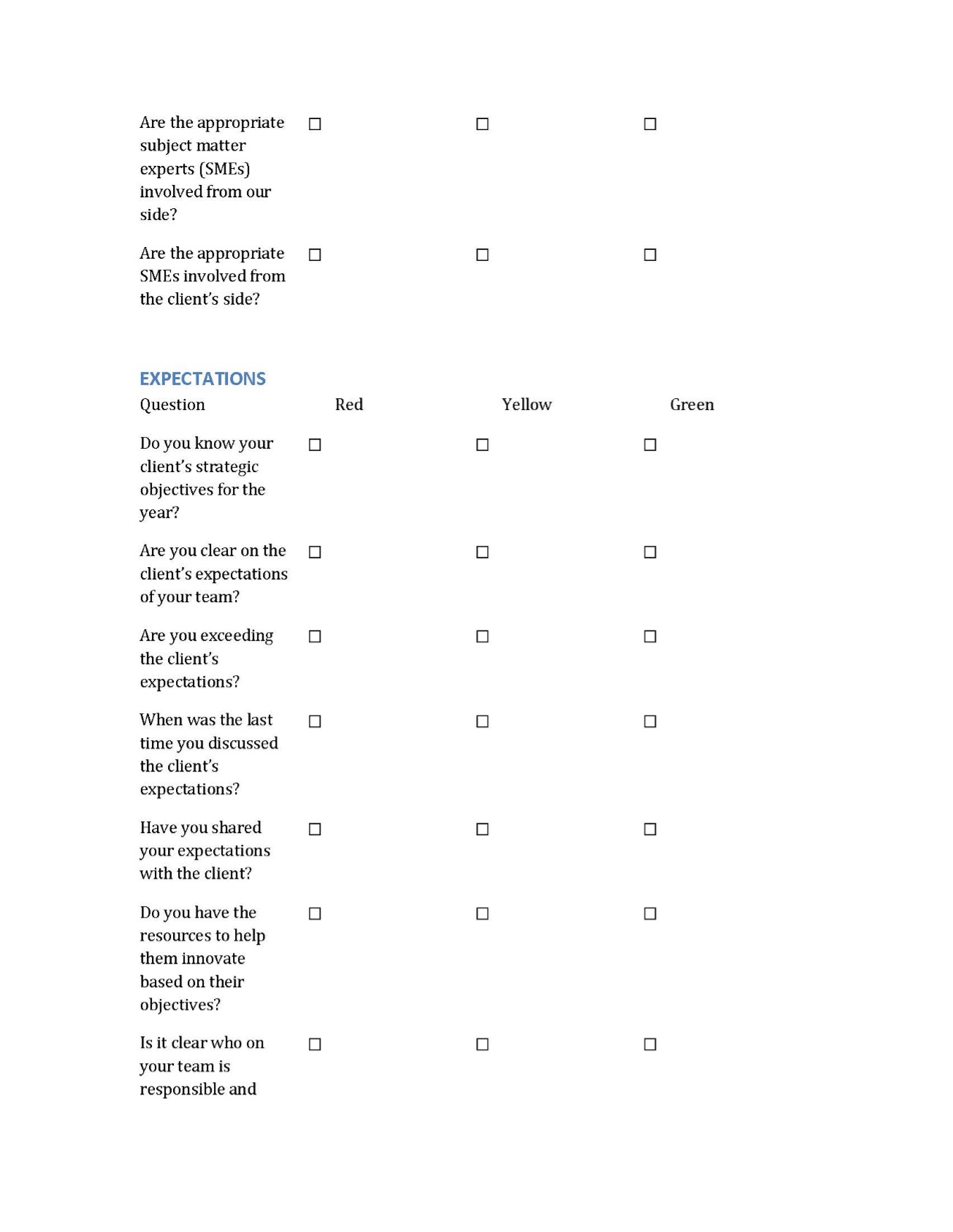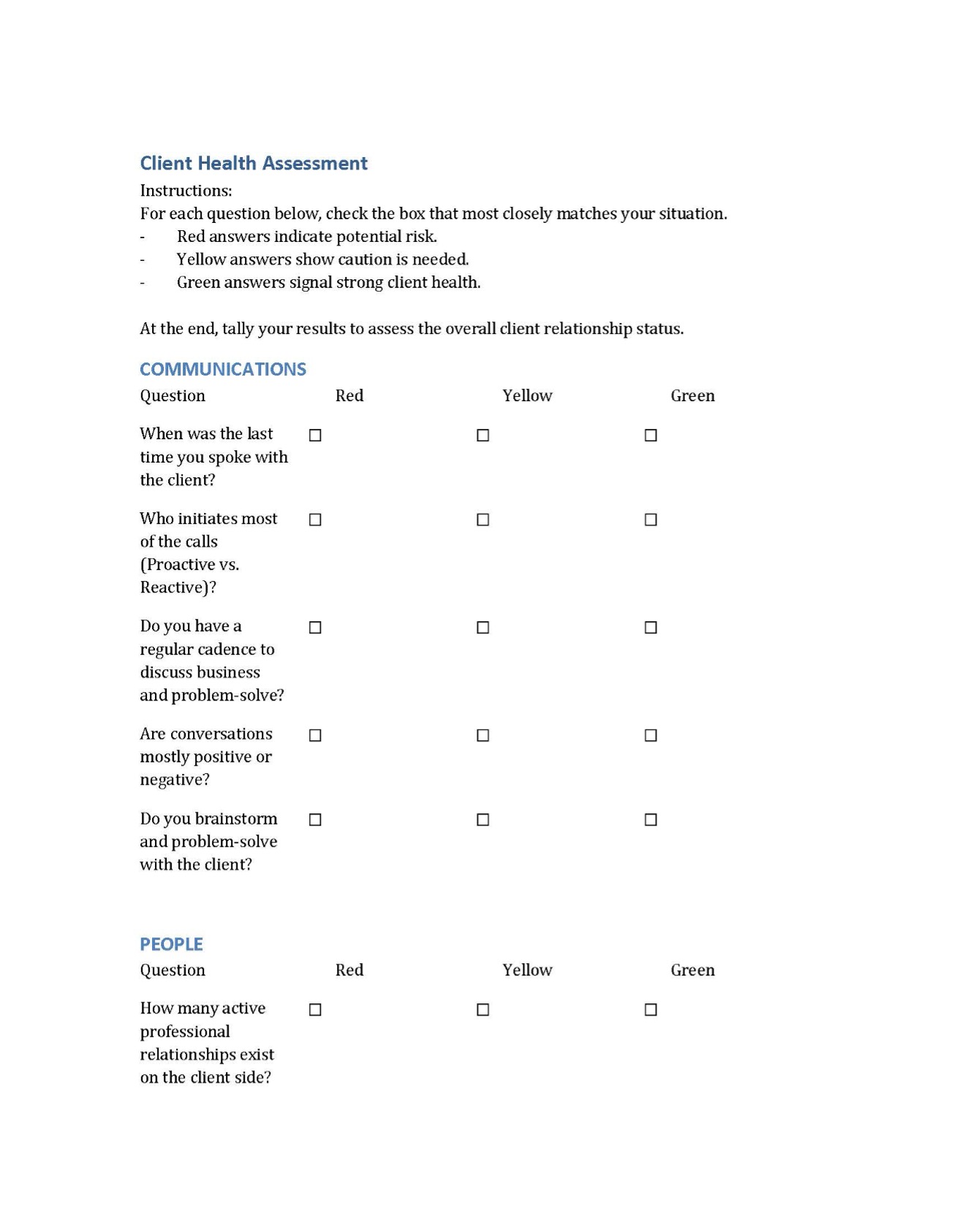 To effectively evaluate the health of your client relationships and organizational performance, you must adopt an unbiased approach to internal assessments. The Client Health Assessment provides a structured way to analyze key areas, including communication, people, and expectations, ensuring that you maintain strong, value-driven partnerships rather than transactional vendor relationships.