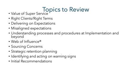 To help set you up for success, we’ll cover a wide range of topics: Right Clients/Right Terms®, Lessons Learned, Warning Signs, Account Selection, the Client Journey, Account Based Marketing, CRMs and Accountability, Standard Operating Procedures, and Training. These are critical building blocks that support a scalable and repeatable client retention strategy. Each one will require thoughtful discussion, planning, and follow-through—but don’t worry, we’ll tackle them together, one step at a time.