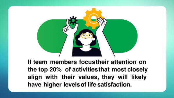 This macro idea can also benefit the micro aspects in your company. For instance, if team members focus their attention on the top 20% of activities that most closely align with their values, they will likely have higher levels of life satisfaction. By encouraging employees to make more boundary-focused decisions, your company should be able to lower burnout.