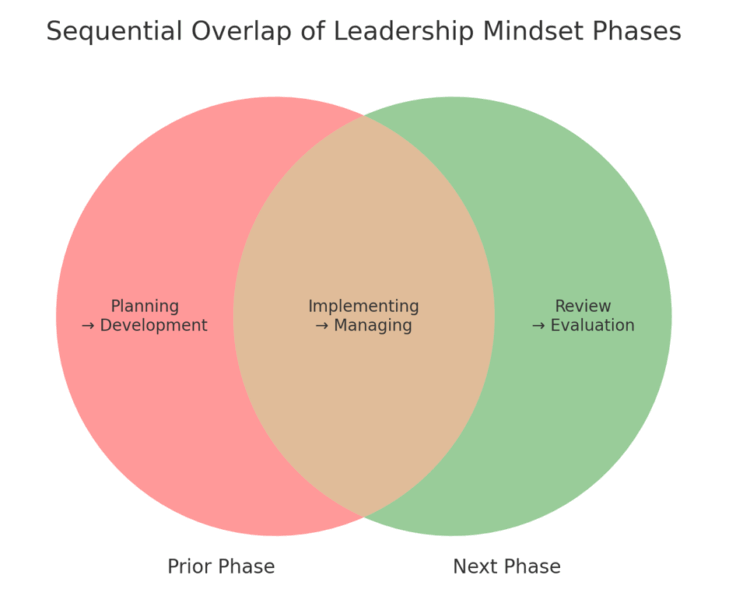 Here’s a conceptual Venn diagram that illustrates how each phase in the Leadership Mindset framework builds upon the previous one. The Venn diagrams uses overlapping sets to highlight the transition and connection between phases.