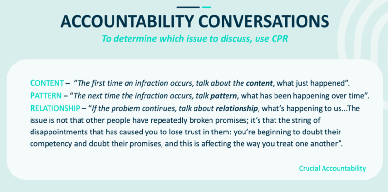 Communicate that you will check in on progress at 5, 10, and 30-day intervals. This is for your learning about what else might be needed for optimizing success. This is not a micromanaging move. Share that you are learning about optimizing crucial conversations for positive progress, and you are simply tracking results and learning about what produces the best and most consistent result. Let them know you would be happy to share your findings with them as well.