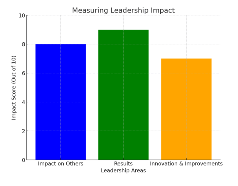 The bar chart below illustrates how leaders can measure their impact across three key areas: impact on others, results, and innovation & improvements. Each bar represents the effectiveness of a leader in these areas on a scale from 0 to 10. The values shown are examples to visually highlight how leadership can be assessed in each domain.