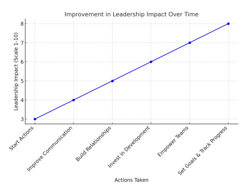 Below is the line graph illustrating the improvement in leadership impact over time as the five key actions are implemented. As each action is taken, there is a noticeable increase in the leadership impact, ultimately leading to a more engaged and effective leadership environment. The graph shows how strategic changes, such as improving communication and empowering teams, can have a positive effect on leadership outcomes.