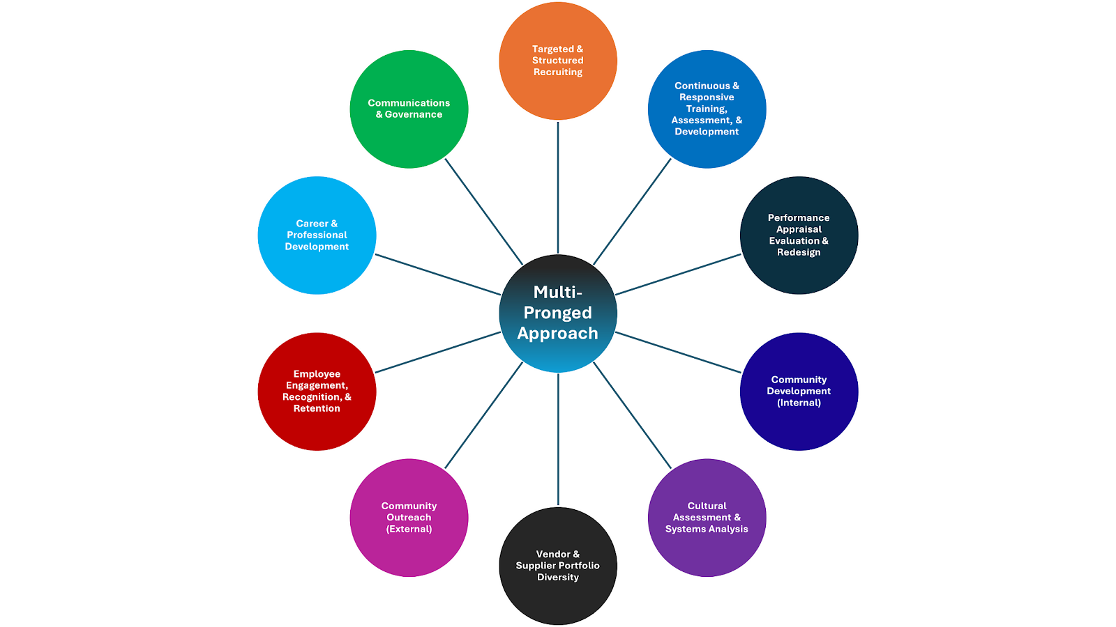The DEI Multi-Pronged Approach is a comprehensive, enterprise-wide transformation strategy designed to catalyze inclusive excellence by embedding diversity, equity, inclusion, and justice (DEIJ) principles across every facet of organizational operations. It functions as a systems-level intervention grounded in organizational diagnostics, cultural audits, and data-informed implementation. The approach activates ten interdependent prongs: Targeted & Structured Recruiting; Assessment, Training & Development; Redesign of the Performance Appraisal System; Community Development Among Associates; Cultural Assessment & Systems Analysis; Vendor & Supplier Diversity; Community Outreach Execution Plan; Employee Engagement, Recognition & Retention; Career & Professional Development; and Communications & Governance. Each element strategically disrupts legacy systems within the organizational ecosystem, targeting points of cultural friction, systemic exclusion, and bias with scalable, data-driven interventions designed for global application.
