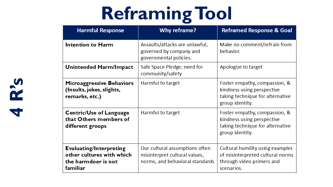Our 4R Model may be leveraged as clients work to interrupt and mitigate implicit and explicit interpersonal biases. Our goal in providing this tool is to equip leaders and decision makers with resources that enable platforms for employee dialogue, particularly those regarding issues that impact the manner and quality of the work they do each day.