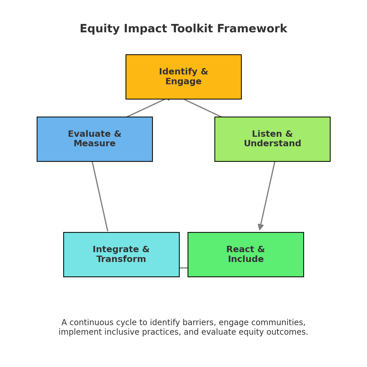 The Equity Impact Toolkit Framework is a strategic, iterative process designed to embed equity-centered thinking into every stage of organizational planning, policy development, and decision-making. Grounded in applied equity analysis, the framework empowers leaders to move beyond performative inclusion efforts by equipping them with the tools to identify gaps, engage stakeholders, and co-create transformative change. Through five interlocking phases—Identify & Engage, Listen & Understand, React & Include, Integrate & Transform, and Evaluate & Measure—organizations gain a clear pathway for continuously addressing inequities and dismantling structural barriers.