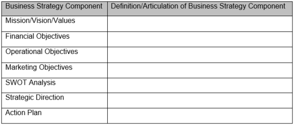 Also, as referenced during the workshop, hopefully there already is a business strategy in place that can be leveraged for our purposes. Assuming this is true, all that is required here is to extract the relevant portions of the strategy and populate our seven-component framework with its content.