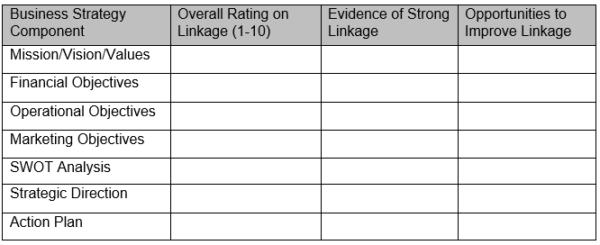 Course Module 11 illustrated how to evaluate the linkage between business and brand strategy. In the workshop, we asked you to provide a high-level rating indicating the approximate strength of linkage between business and brand across the seven components of the business strategy framework. Now, we’d like you to more formally assess that linkage for your brand. Please refer to the frameworks and tools provided in Course Module 11 for assistance.